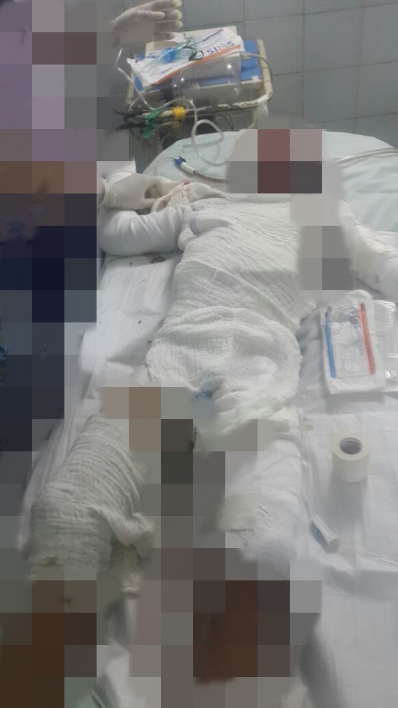 un menor de 11 años. Este niño tiene quemaduras de primer y segundo grado en un